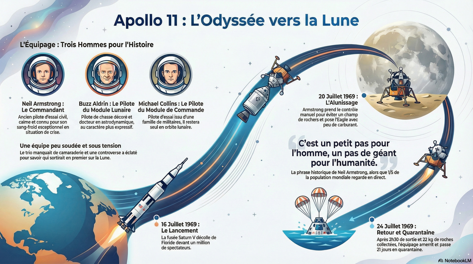 Depuis l’aube de l’humanité, le désir d’explorer, de franchir les frontières et de découvrir l’inconnu a toujours été un puissant moteur. Ce même élan qui a poussé les grands pionniers à traverser les océans et les continents a mené, en juillet 1969, deux hommes à fouler le sol d’un autre monde. La Lune, cet astre fantasmé par des générations, s’est révélée être une « magnifique désolation », un désert hostile et silencieux. La mission Apollo 11, aboutissement des efforts titanesques des missions précédentes (Apollo 7, 8, 9 et 10), représente le point culminant de cette quête. Au cœur de cette épopée se trouvent trois hommes : Neil Armstrong, Buzz Aldrin et Michael Collins, dont les noms sont à jamais inscrits au panthéon de l’exploration humaine.